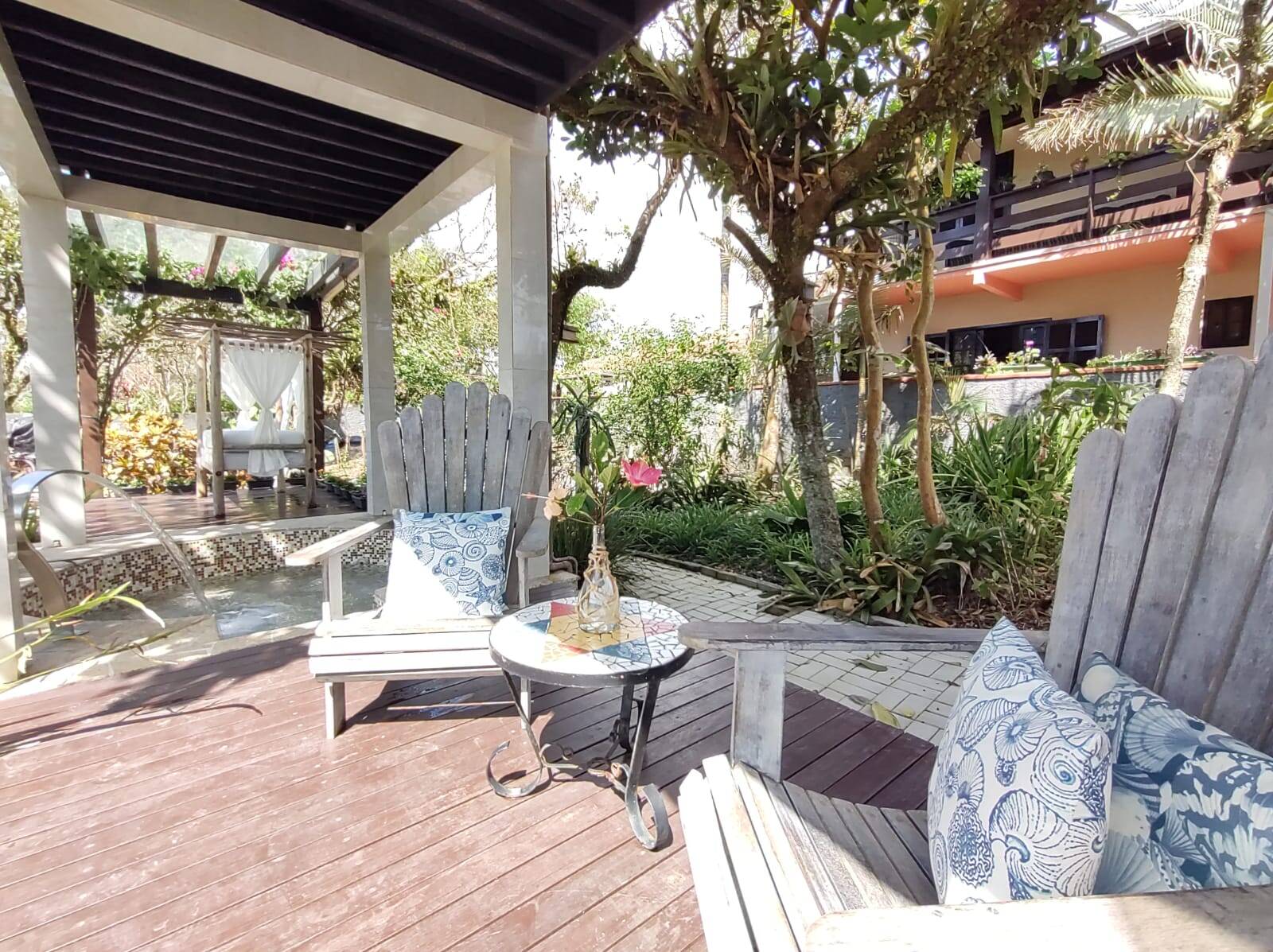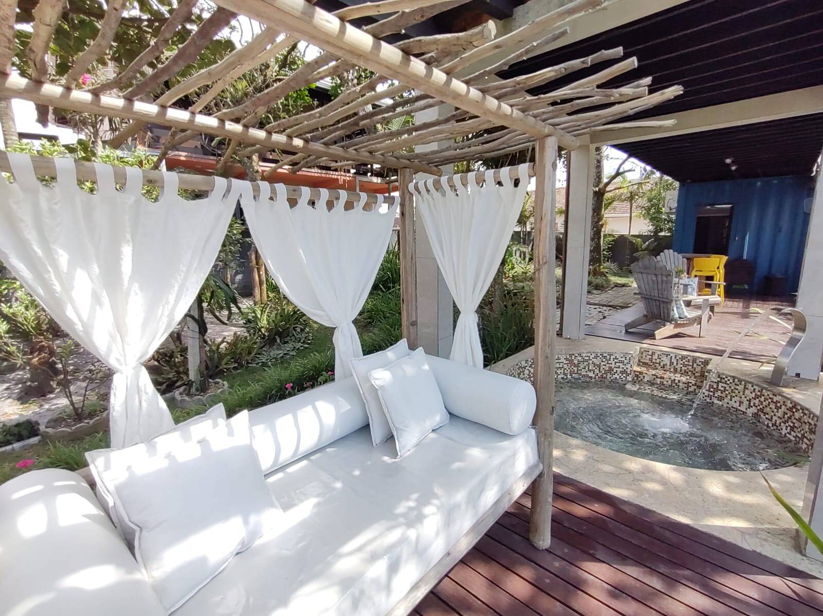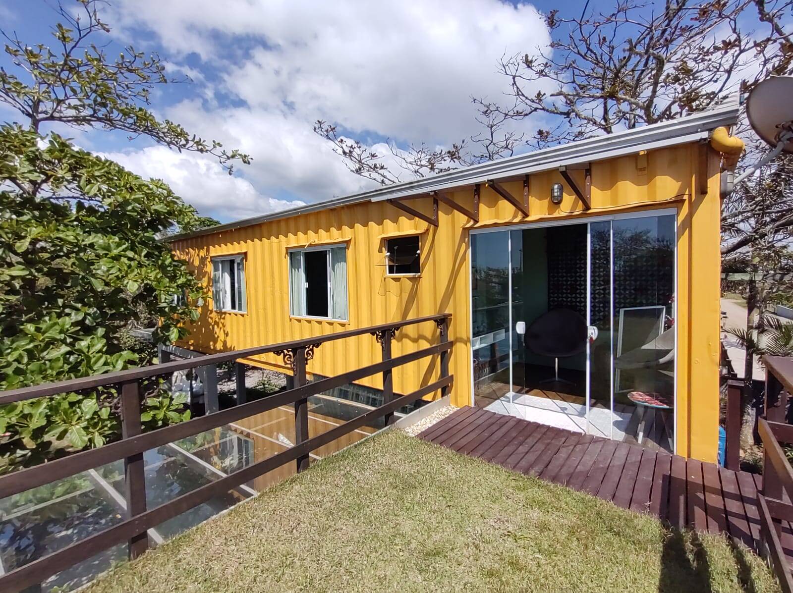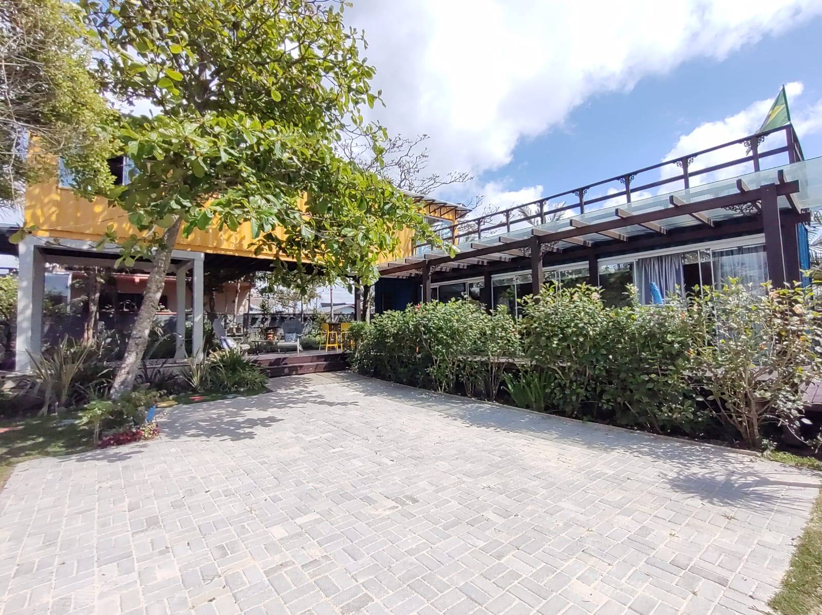 A segunda edificação, trata-se de um excelente sobrado (em container), distribuído na parte térrea: cozinha com área externa para as refeições (em deck), lavanderia e 02 banheiros sociais. No piso superior conta com 02 dormitórios, banheiro social, área de estar e mirante. Área externa com gramado, lareira, hidro massagem com água aquecida por painel solar, chafariz e flores.